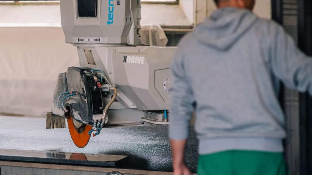A gép mindig tűpontossággal vágja méretre a kőtáblát. A csiszolást pedig élcsiszoló és egy élmegmunkáló szerkezet által végezzük el.
